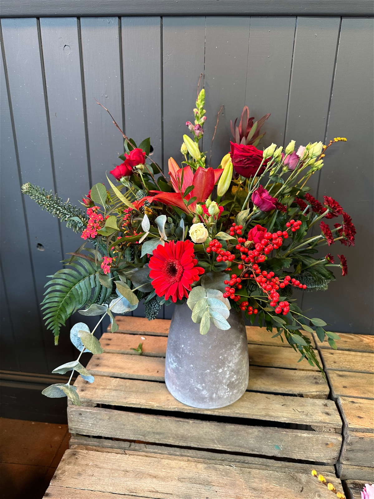 A terracotta glazed, glass vase filled with festive flowers and winter foliage.