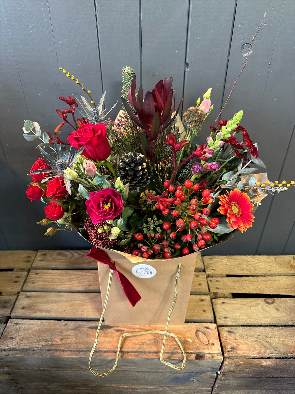 A garden inspired bouquet in warm shades for Christmas. Made with a variety of textured winter foliage and flowers, berry, grasses and seed heads.