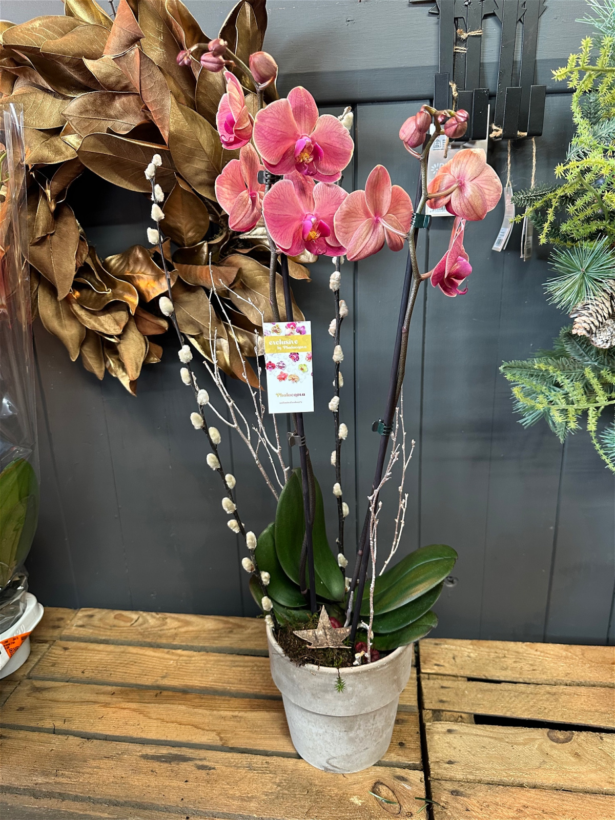 A striking 4 stemmed orange phalanopsis orchid in a rustic, grey terracotta pot adorned with moss, twigs and pinecones. The warm colour is perfect for the festive season.