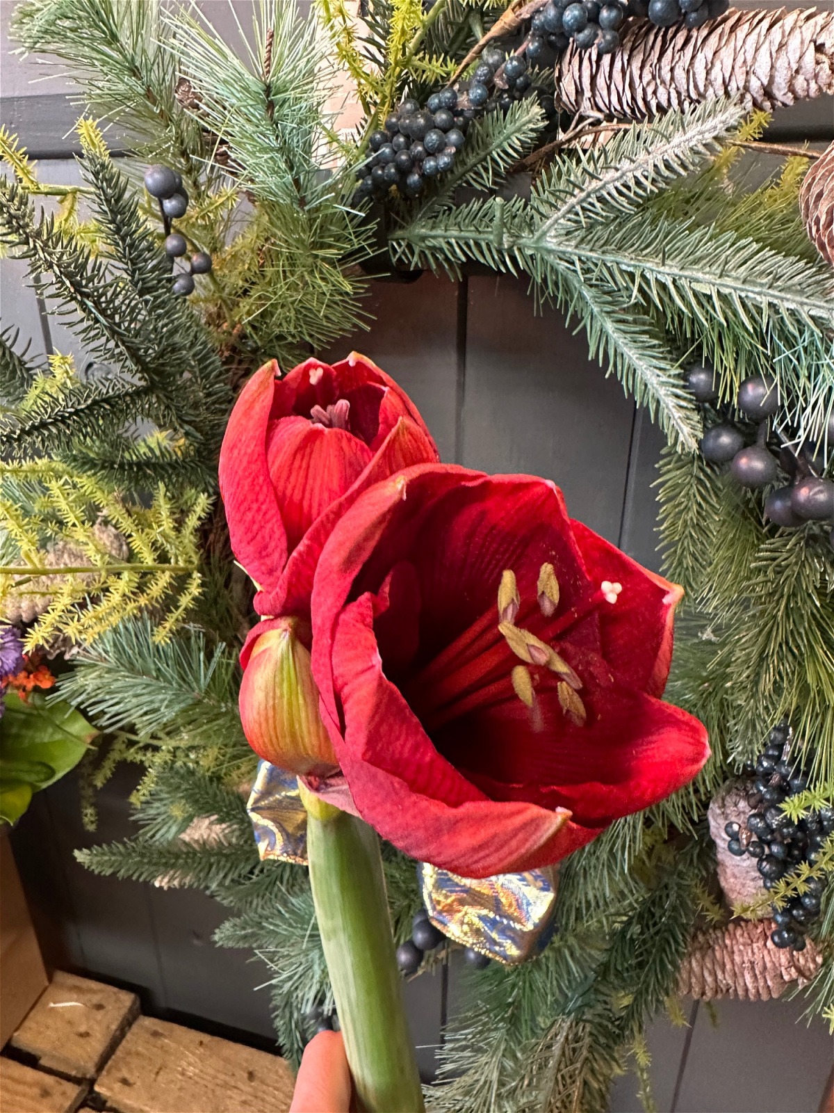 A red amaryllis bulb planted into a tall, pinecone effect, heavy, ceramic vase. Adorned with moss, pussywillow and festive garnish.